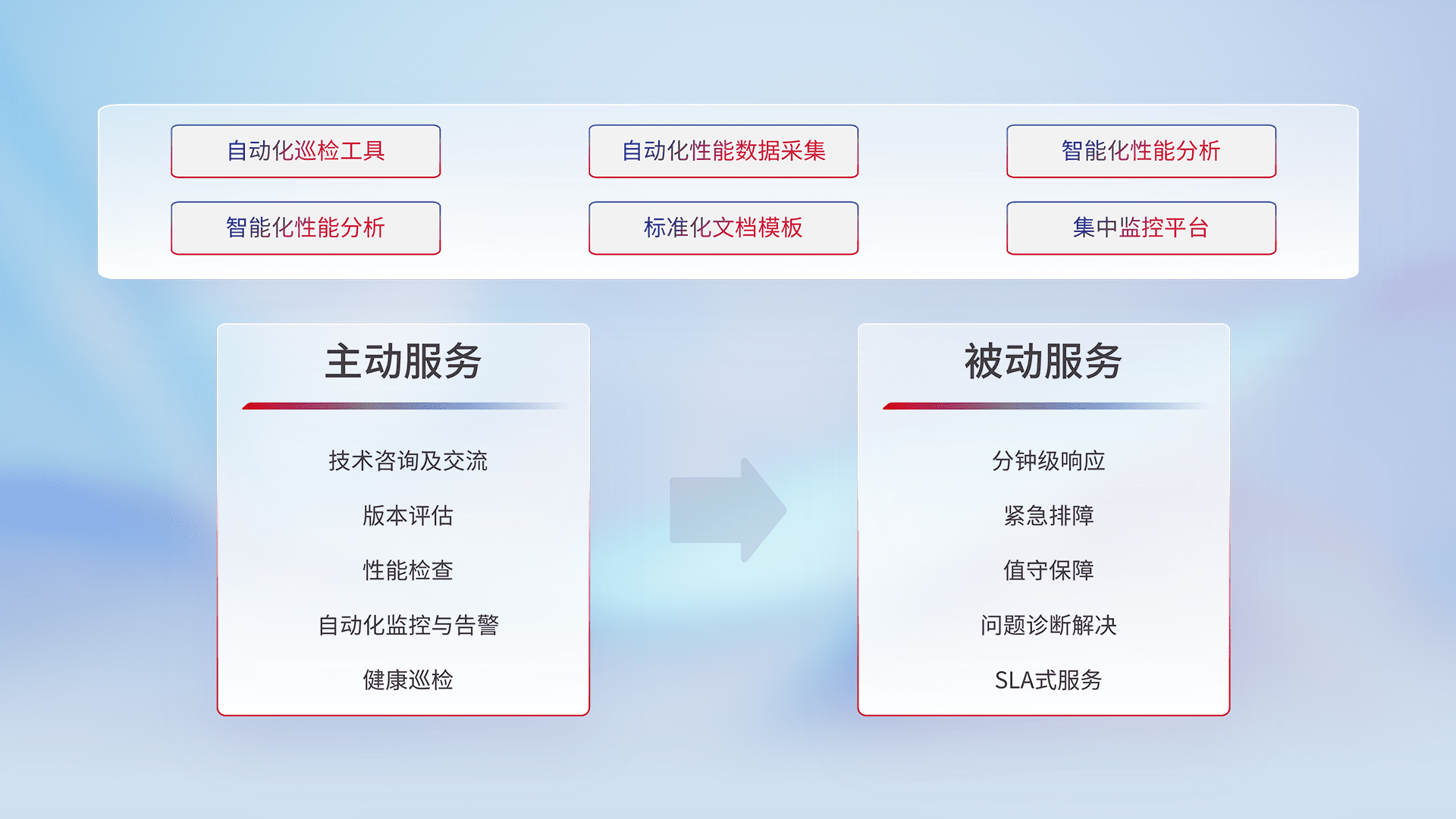 智能化工具和标准化文档,,,保障服务质量,,,提供主动服务(包含技术咨询、、版本评估、、、性能检查、、自动化监控与告警、、、、健康巡检)和被动服务包含(分钟级响应、、、、紧急排障、、、、值守保障、、、问题诊断解决、、、SLA服务)。。。